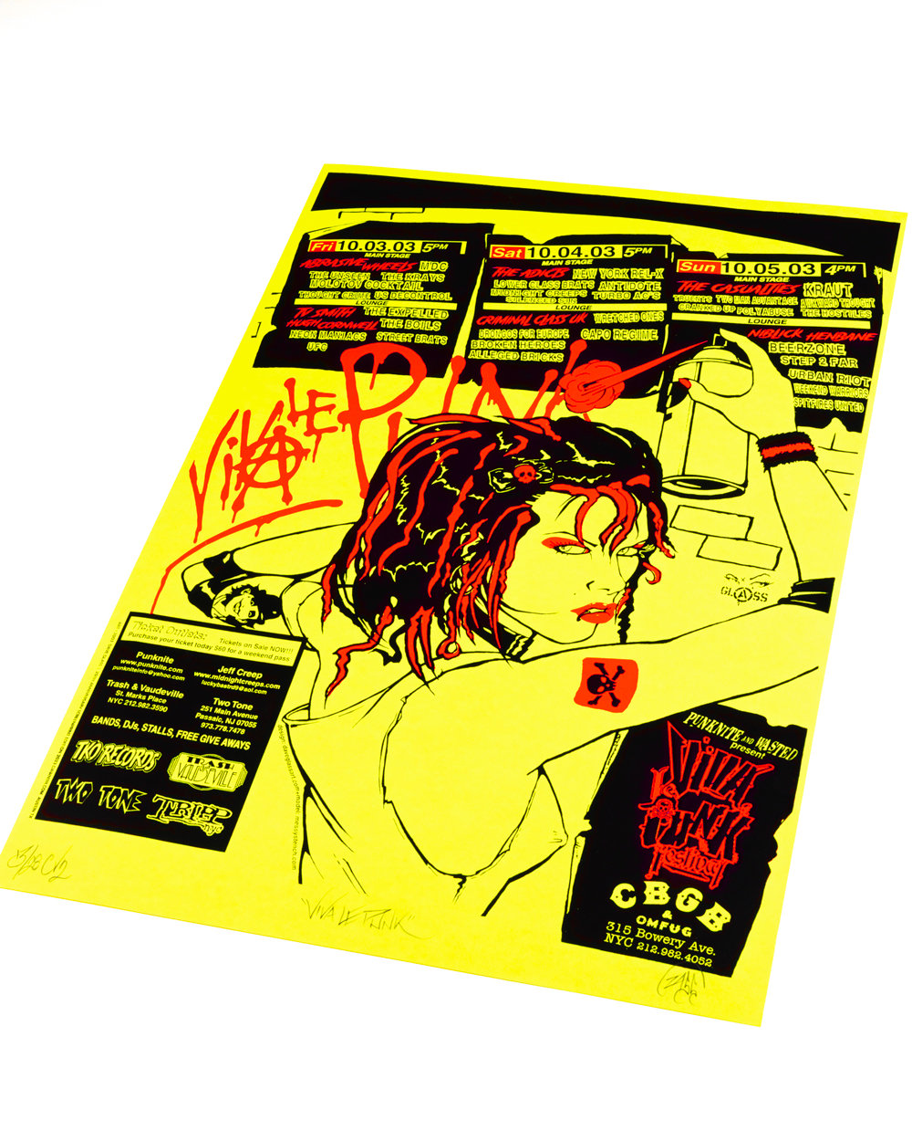 In celebration of the 22nd Anniversary of the CBGB, R.I.P., first original Viva Le Punk Festival, Dave Glass decided to reprint a small run of only 28, in black and neon pink ink, on neon yellow cardstock, to commemorate the event. These were never before available as a silkscreen print. Originally in 2003, these posters were offset prints in black and red on white cardstock. 500 posters were initially printed for street promotion and to sell at the Viva Le Punk Festival, with a mere 42 of them signed.